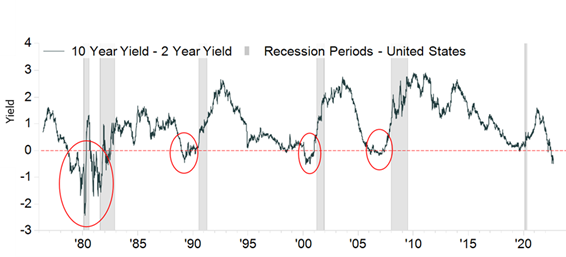 - The 10-year to 2-year Treasury yields have been inverted since May 7, 2022 and were recently inverted by more than 40 basis points. Relative to previous inversions, this would rank among the more severe.